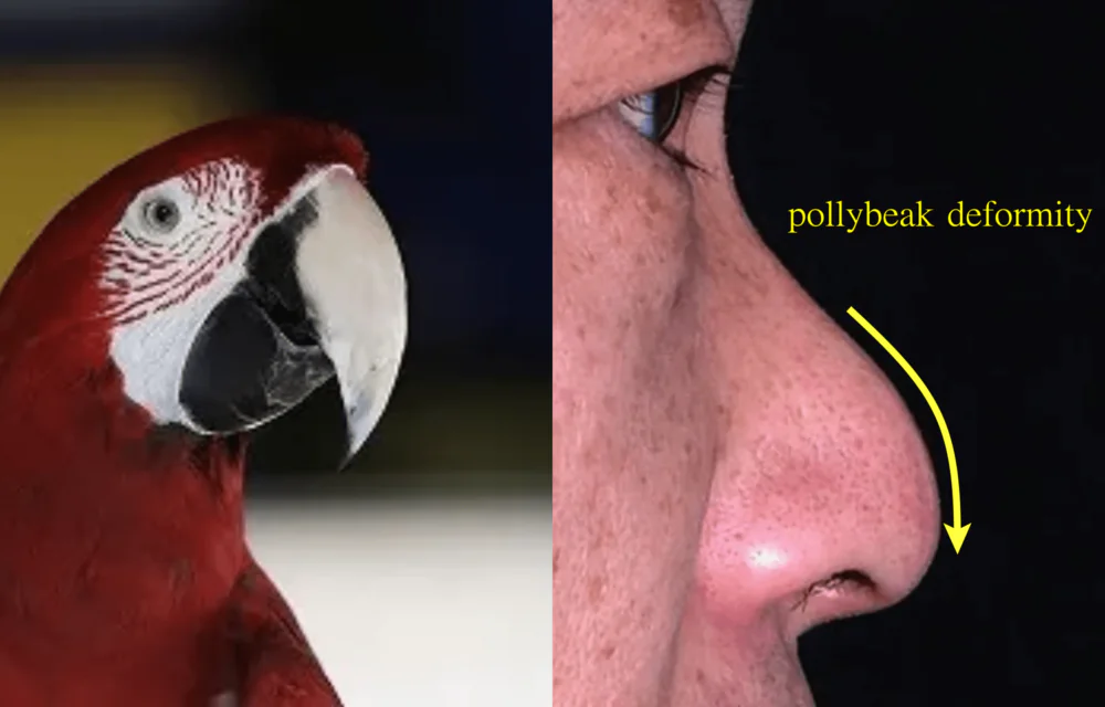 このポリービーク変形の特徴としては、鼻尖突出点がなく明瞭度が失われ、鼻背ラインが外側に向かって凸方向になってしまい、鼻尖の直上部位が盛り上がっているように見えて、スッと伸びた印象は与えず、美容的にはあまり好まれません。