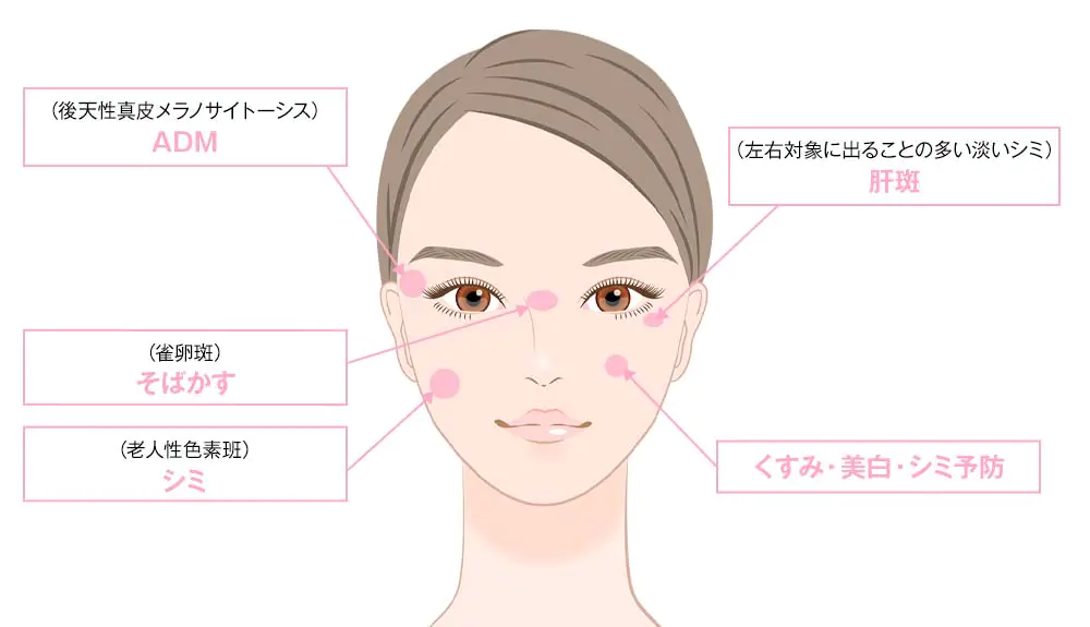 実はシミにはいくつかの種類があり、症状によって治療法が異なります。誤った治療を行うとシミやそばかすが濃くなってしまうこともありますので、安易な自己判断はせず、まずはドクターにご相談ください。