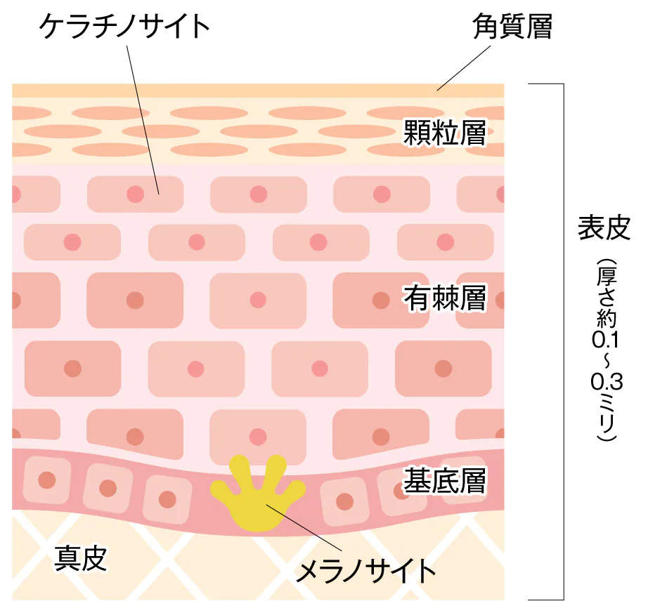 表皮は表皮細胞(ケラチノサイト)、色素細胞(メラノサイト)などからなり、厚さわずか0.1〜0.3ミリの中は「角質層」「顆粒層」「有棘層」「基底層」の4つの層に分かれています。