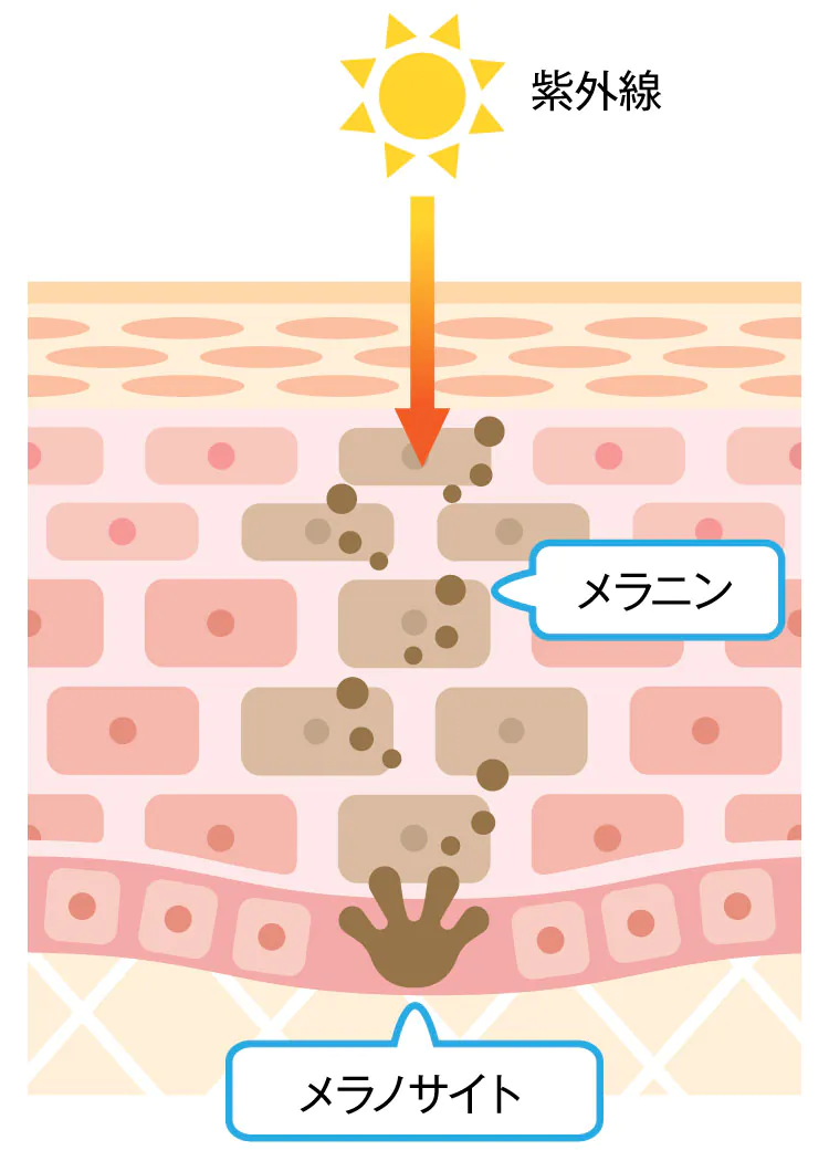長時間または強い紫外線を浴びると、メラノサイトの数が増え、メラニンの生成は活発化します。一方、加齢や紫外線の浴びすぎ、肌への過度の刺激、ストレスなどによりターンオーバーのサイクルが乱れると、新陳代謝が滞留しメラニンも滞留してしまいます。