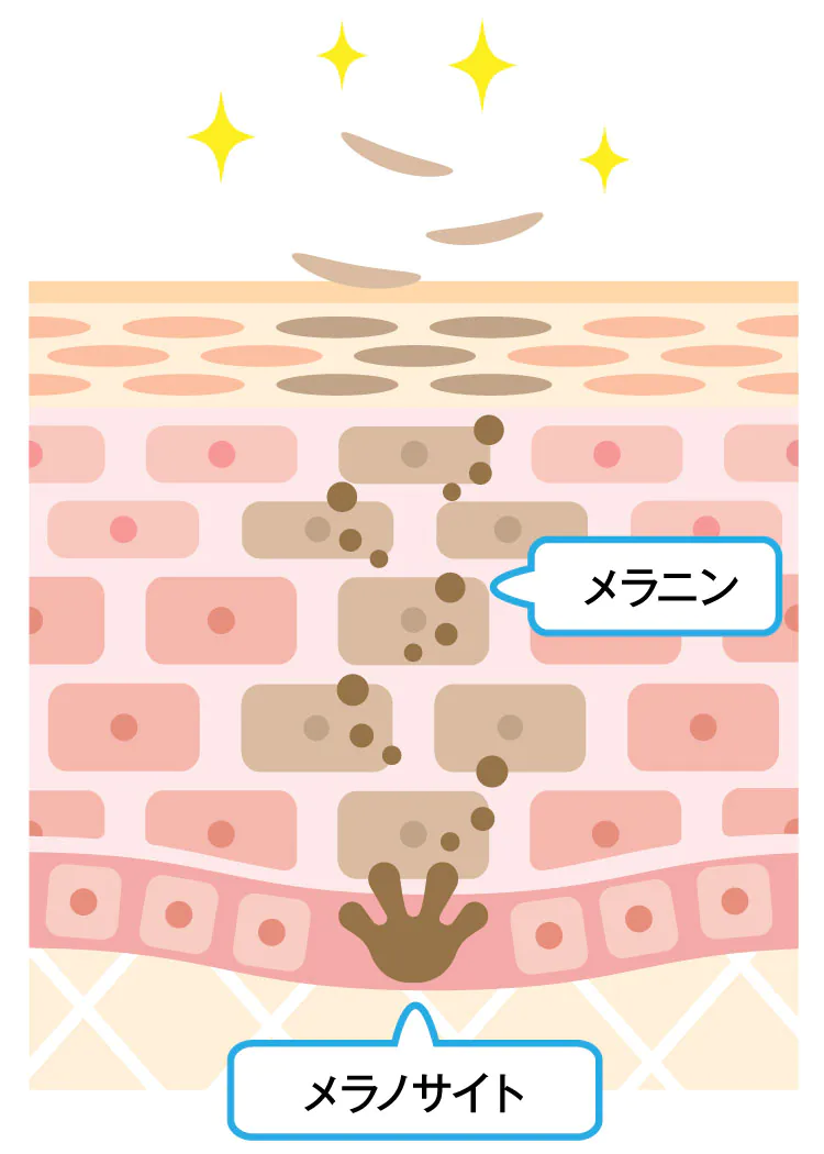 紫外線を浴びてつくられたメラニンも細胞とともにはがれ落ちていくので、通常の一時的な日焼けなら約1ヶ月後には消えるしくみになっています。