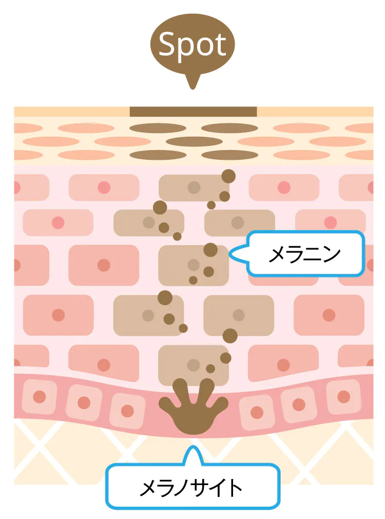たくさん生成されても、なかなか消えていかないメラニン。これが、色素沈着が進んだシミの正体です。