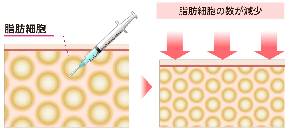 脂肪細胞膜を直接破壊して中性脂肪を取り除き、細胞を壊死させます。脂肪は静脈やリンパ管を通じて自然排出されます。