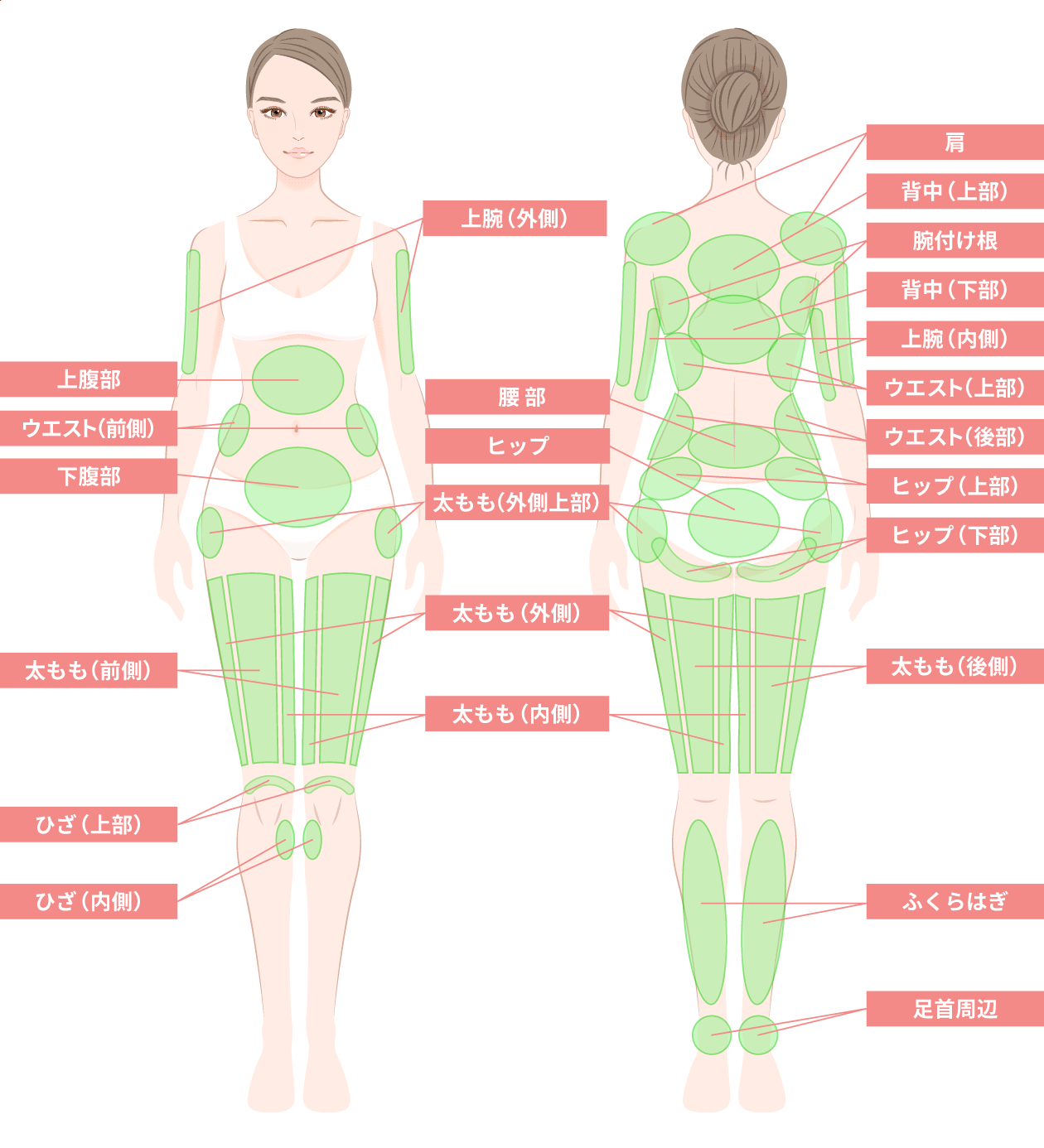 ホホ骨上/ホホ下/アゴ下/エラ下/アゴ下/二の腕・肩/副乳/肩甲骨横/上背部/背中/腰/腹/ウエスト/臀部/太もも内・外/膝上/ふくらはぎ/足首