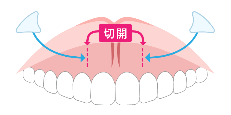 上唇の口腔内粘膜という部分を両側2㎝程切開し、粘膜と口輪筋の間を進み骨に到達します。この骨と骨膜の間にスペースを作りプロテーゼを挿入し、位置などを調整して綺麗で自然な輪郭になるよう仕上げていきます。