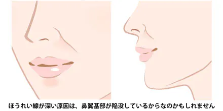 また、鼻翼基部の陥没で相対的に、口元が突出して見えてしまうこともあります。口元が突出していると動物的や垢ぬけない印象を与えてしまうこともあるので、口元でお悩みの方にも貴族手術(鼻翼基部プロテーゼ・脂肪注入)をご提案させていただく場合がございます。